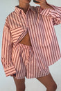 Meet the Wilson Set, Effortless and relaxed, this striped lounge set is the perfect blend of comfort and style. Featuring an oversized button down shirt with a collared neckline, dropped shoulders, and a front pocket detail, paired with matching relaxed shorts.